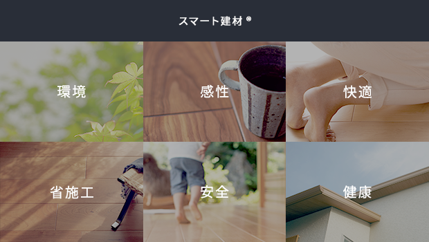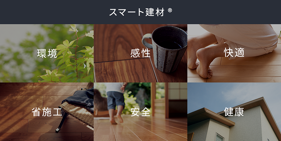 新しい価値の創造に挑戦し続ける朝日ウッドテックが今新たに提案しているのが、木質材料の特性を最大限に活かした、快適で、住まい手の心とからだにエネルギーが自然と満ちてくる室内環境です。そこにいるだけでやすらぎ、安心に包まれ、元気になれる - そんな室内環境をつくり、支える新しい建材として構想し、開発しているのが「スマート建材」です。スマート建材である条件は、感性に響く価値や、暮らしの安全性や快適性などを高める新しい機能があること。キーワードは「感性」「快適」「健康」「安全」「省施工」「環境」の6つ。進化し続ける X-NEXT テクノロジーからの新しい提案です。