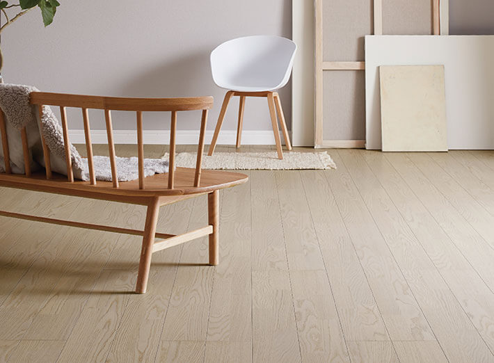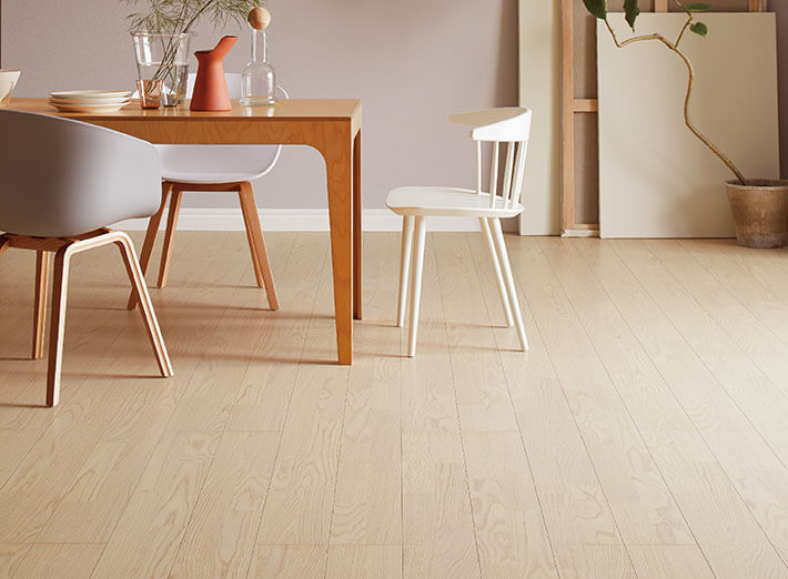 表面の突き板に着色塗装をしたカラーフロアシリーズ。突き板には、個性的な木目のアッシュやなじみ深いオークを採用。