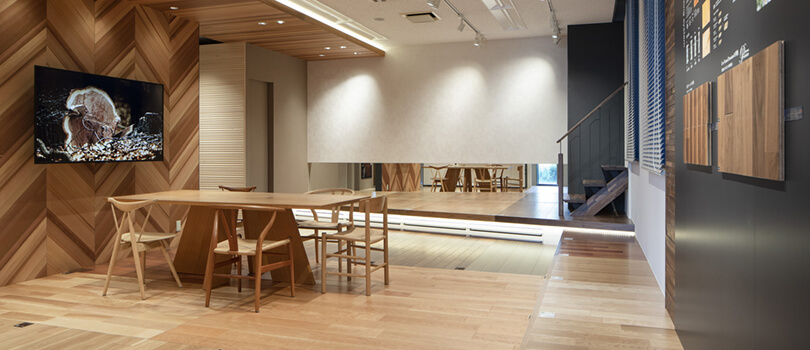福岡ショールームはフローリング、壁材を中心にこだわり抜いた天然木の本質美を五感で体感いただけるショールームです。ディティール、色調など実際に触れて感じていただけるよう広い面積でフローリングを展示。