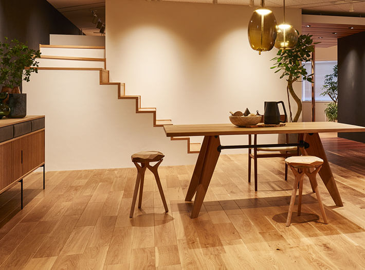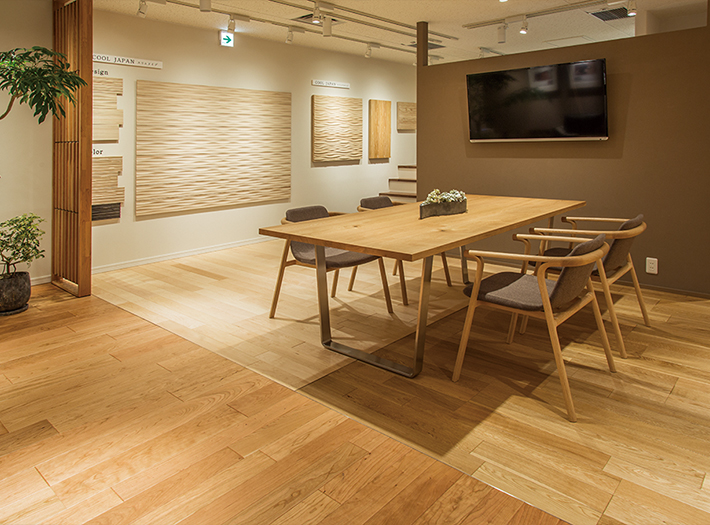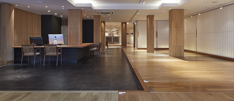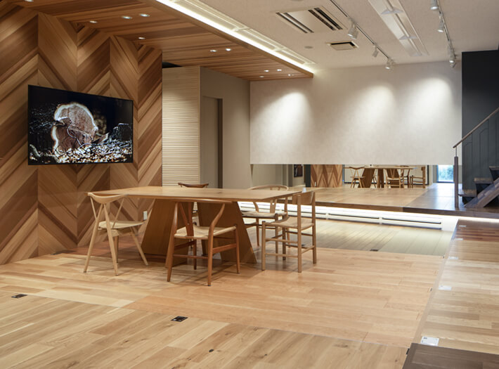 「洗練された素材の森」をコンセプトに、こだわり抜いた天然木の本質美を五感で体感いただけるショールームです。ディティール、色調など実際に触れて感じていただけるよう広い面積でフローリングを展示。靴脱ぎのショールームではフローリングの化粧材による足ざわりの違い、床暖房や防音フローリングの踏み感などを体感していただけます。