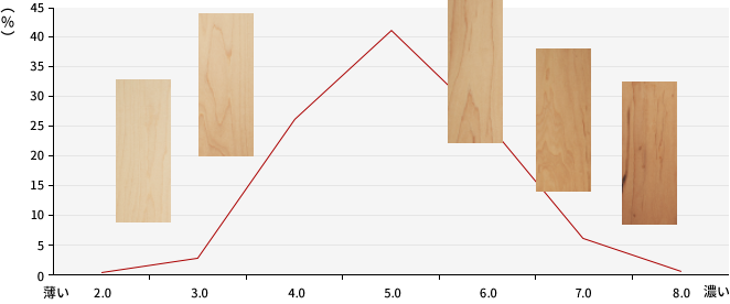 下のグラフはハードメイプルから採れる材の赤みの濃淡別の出現率を表すグラフです。