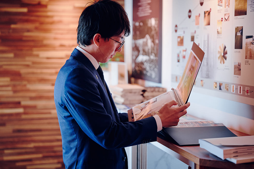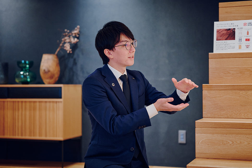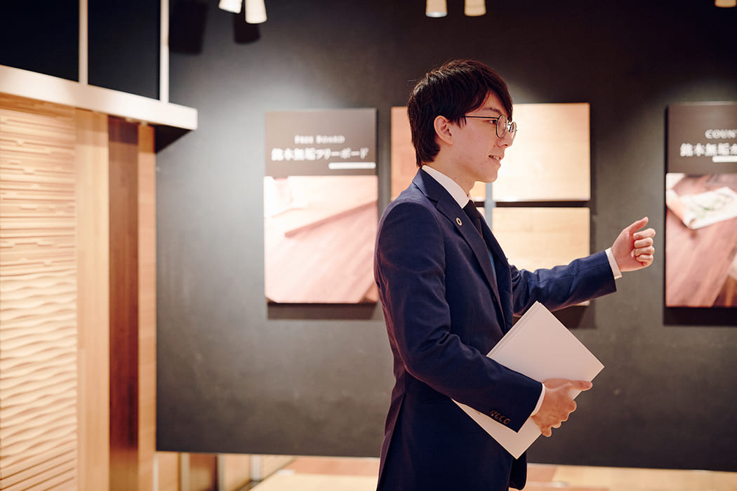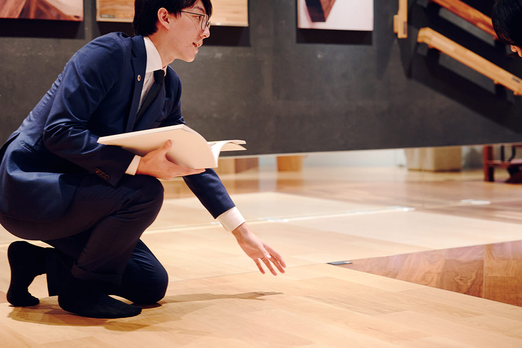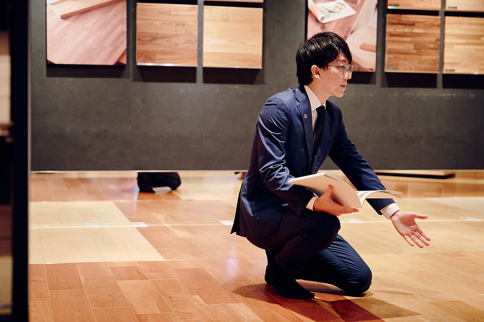 ファンになってもらうために、営業の際には初めに安い商品ではなく、私たちの強みである質の高いフローリングを紹介します。新規開拓には一見、安いものが売りやすく魅力的かもしれませんが、各メーカーが安い商品を多く生産しており、コスト面はシビアな世界。私たちのフローリングの価値、トレンド感をお見せすることで、高級品を扱っていない会社の方にも興味を持っていただけるようにしています。