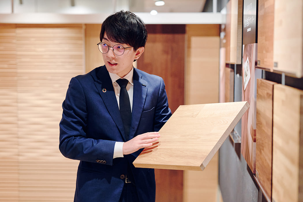 私は以前リフォーム会社に勤めていたのですが、そこでは朝日ウッドテックのフローリングの良さが際立っていました。転職を機に、自分の好きな商品の魅力を存分に伝えられるようになって、仕事にやりがいを感じています。