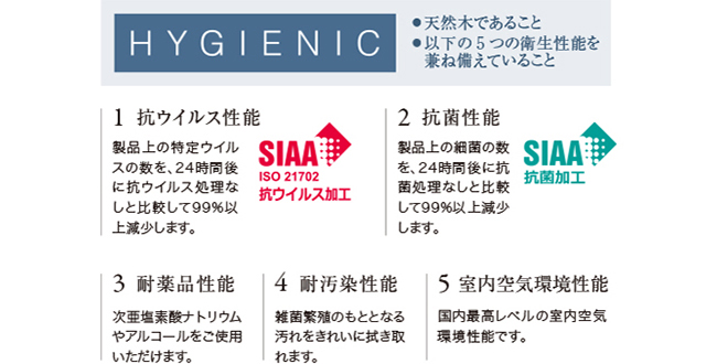 朝日ウッドテックのハイジェニック仕様は、日本で初めてSIAA(抗菌製品技術協議会)の認証を得た抗ウイルス・抗菌性能を持つ天然木フローリング。床には会話や咳による飛沫が集中して落下し、床に触れた手足からウイルスや細菌への感染が広がる可能性があると言われています。足もとからの衛生的な暮らしをみなさまにお届けします。