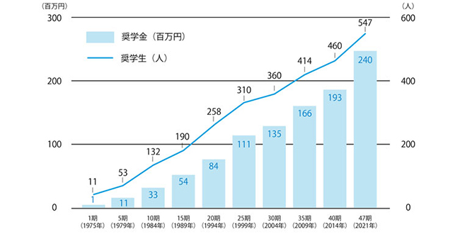 公益財団法人朝日ウッドテック財団は、経済的に学資の支弁が困難と認められる者に対して奨学金を給付するとともに、大学研究機関に所属する者が行う木材加工分野等に関する優れた学術研究に助成することにより、有為の人材育成と学術研究の振興に寄与することを目的として活動を行っています。1975年の財団創設からこれまでの47年間に、のべ540人の学生・生徒に累計で約2億5千万円の奨学金を給付し、学びを支援してきました。